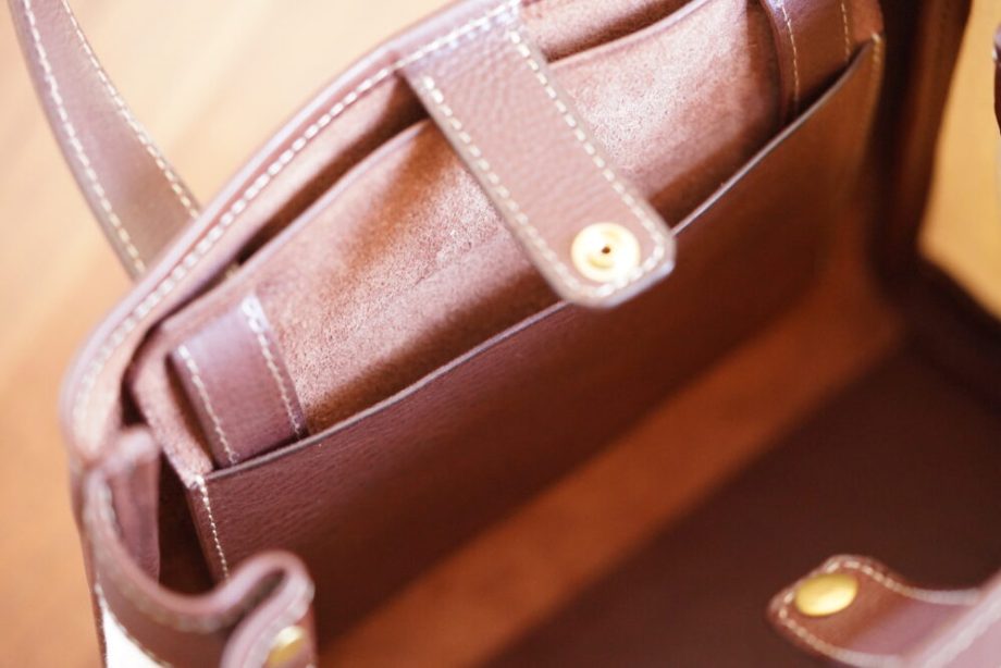 前胴に生成りの帆布を、背胴から底にミネルバ・ボックスのTabaccoを使用しています。